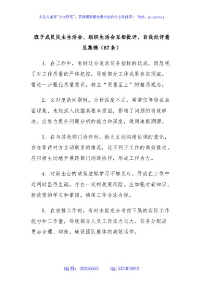 / 班子成员民主生活会、组织生活会互相批评、自我批评意见集锦(87条)