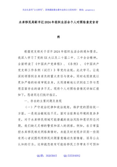 / 水库移民局副书记2024年组织生活会个人对照检查发言材料