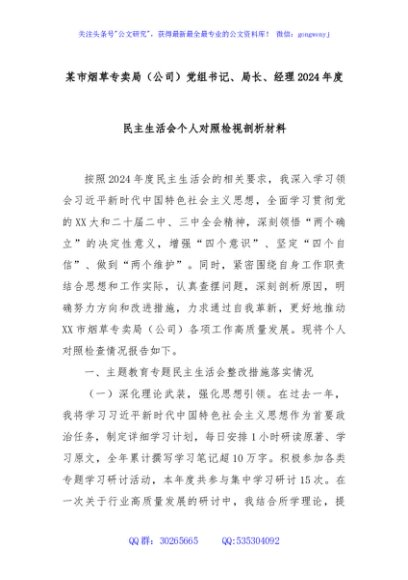 / 某市烟草专卖局(公司)党组书记、局长、经理2024年度民主生活会个人对照检视剖析材料