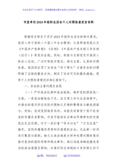 / 市直单位2024年组织生活会个人对照检查发言材料