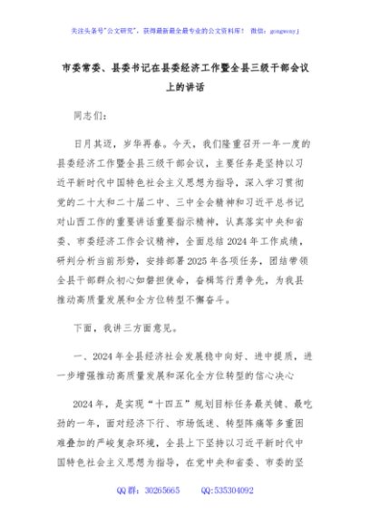 / 市委常委、县委书记在县委经济工作暨全县三级干部会议上的讲话