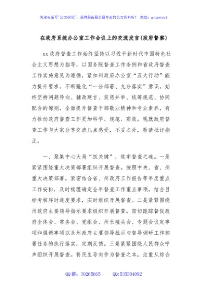 / 在政府系统办公室工作会议上的交流发言(政府督察)