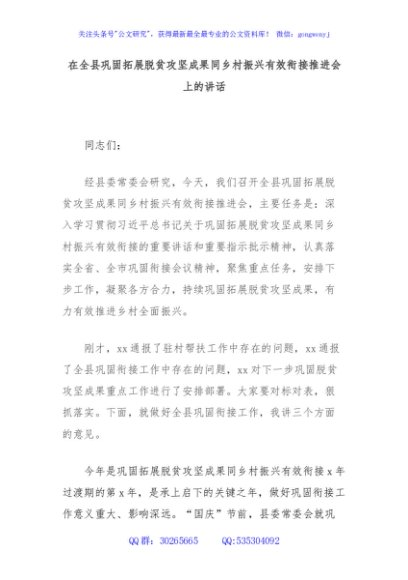 / 在全县巩固拓展脱贫攻坚成果同乡村振兴有效衔接推进会上的讲话