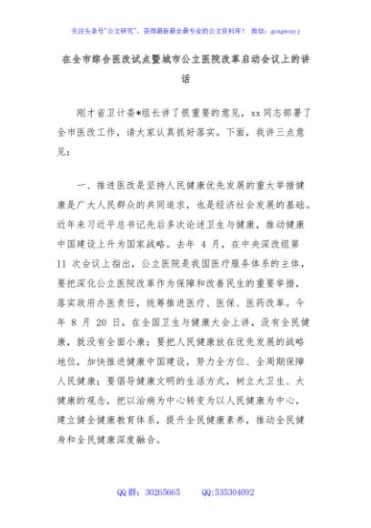/ 在全市综合医改试点暨城市公立医院改革启动会议上的讲话