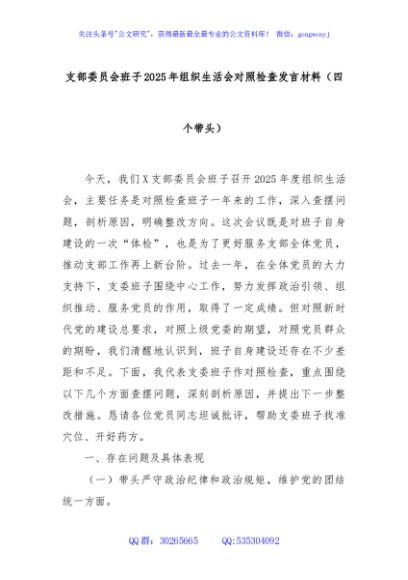 / 支部委员会班子2025年组织生活会对照检查发言材料(四个带头)