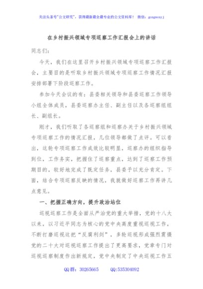 / 在乡村振兴领域专项巡察工作汇报会上的讲话