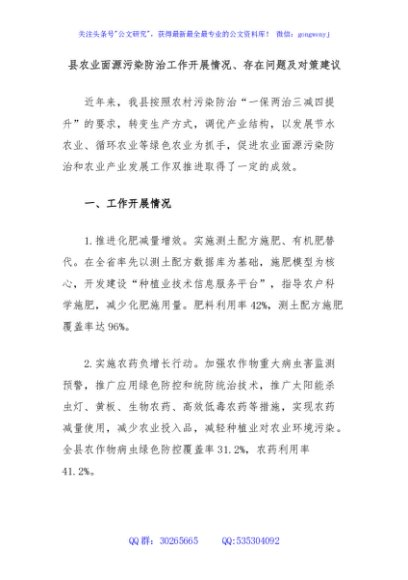 / 县农业面源污染防治工作开展情况、存在问题及对策建议