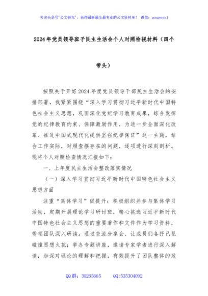 / 2024年党员领导班子民主生活会个人对照检视材料(四个带头)