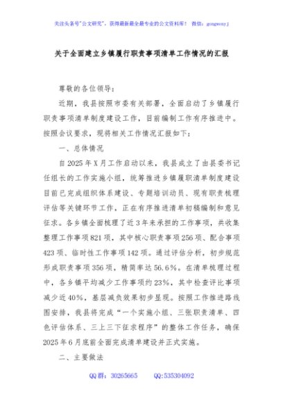/ 关于全面建立乡镇履行职责事项清单工作情况的汇报