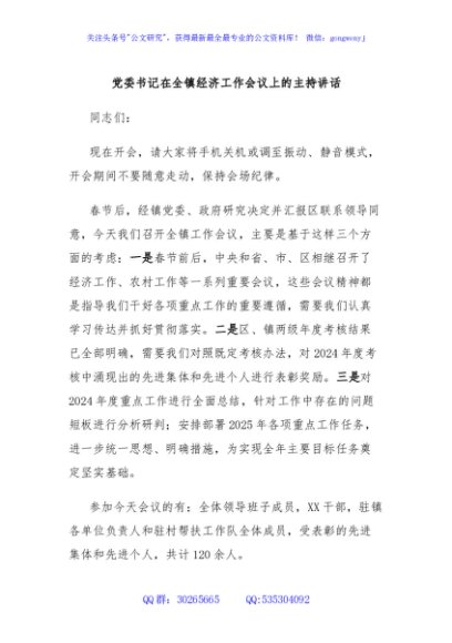 / 党委书记在全镇经济工作会议上的主持讲话
