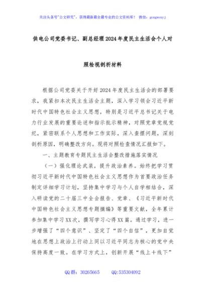 / 供电公司党委书记、副总经理2024年度民主生活会个人对照检视剖析材料