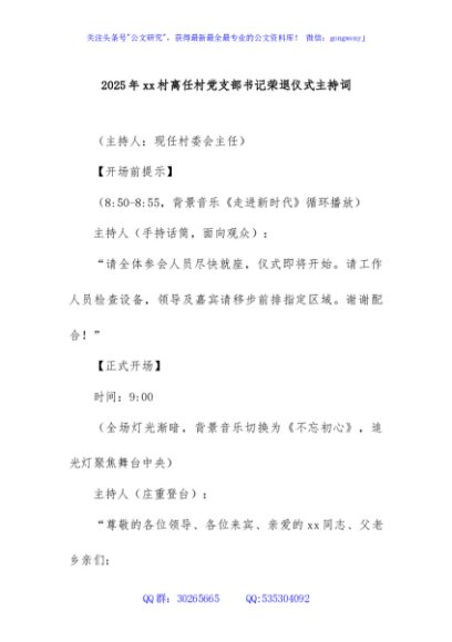 / 2025年xx村离任村党支部书记荣退仪式主持词