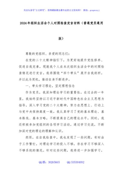 / 2024年组织生活会个人对照检查发言材料(普通党员通用版)