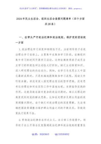 / 2024年民主生活会、组织生活会查摆问题清单(四个方面共28条)