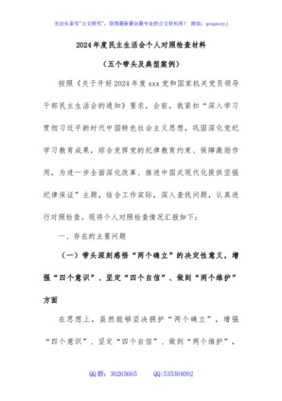 / 2024年度民主生活会个人对照检查材料(五个带头及典型案例)