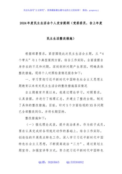 / 2024年度民主生活会个人发言提纲(党委委员,含上年度民主生活整改措施)