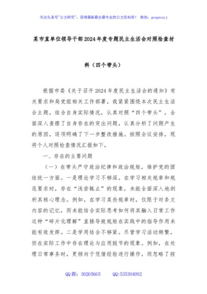 / 某市直单位领导干部2024年度专题民主生活会对照检查材料(四个带头)