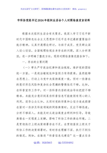 / 市科协党组书记2024年组织生活会个人对照检查发言材料