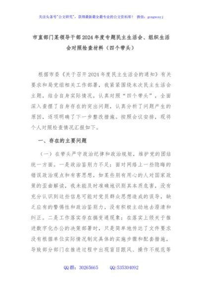 / 市直部门某领导干部2024年度专题民主生活会、组织生活会对照检查材料(四个带头)