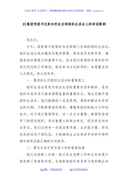 / XX集团党委书记参加所在支部组织生活会上的讲话提纲