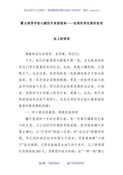 / 薪火相传守初心继往开来担使命——在退休同志荣休欢送会上的讲话