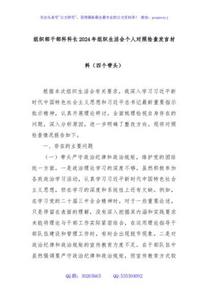 / 组织部干部科科长2024年组织生活会个人对照检查发言材料(四个带头)