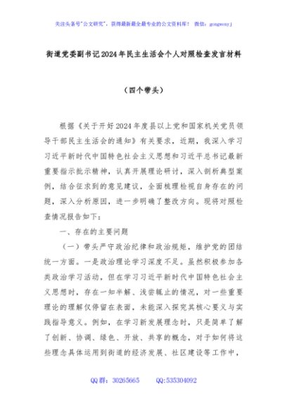 / 街道党委副书记2024年民主生活会个人对照检查发言材料(四个带头)