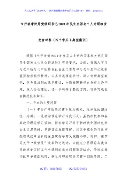/ 市行政审批局党组副书记2024年民主生活会个人对照检查发言材料(四个带头+典型案例)