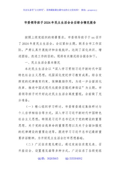 / 市委领导班子2024年民主生活会会后综合情况报告