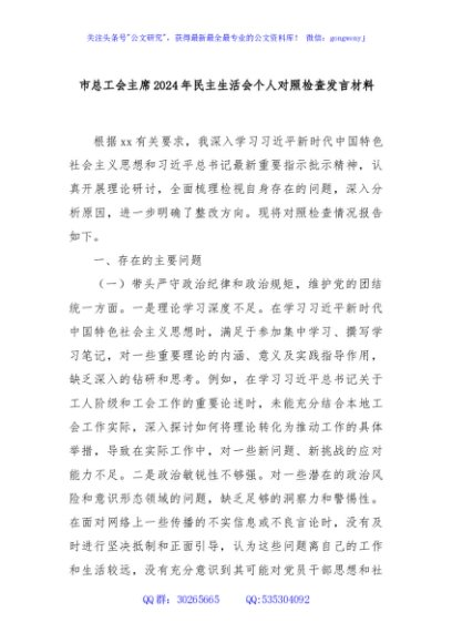 / 市总工会主席2024年民主生活会个人对照检查发言材料