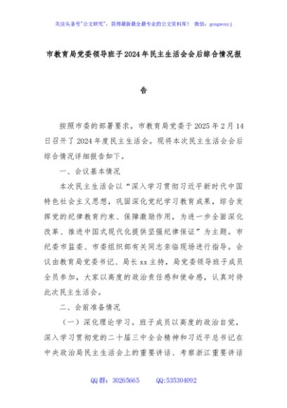/ 市教育局党委领导班子2024年民主生活会会后综合情况报告
