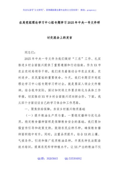 / 在局党组理论学习中心组专题学习2025年中央一号文件研讨交流会上的发言