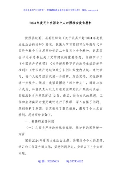 2024年度民主生活会会前准备情况+典型案例剖析+表态发言