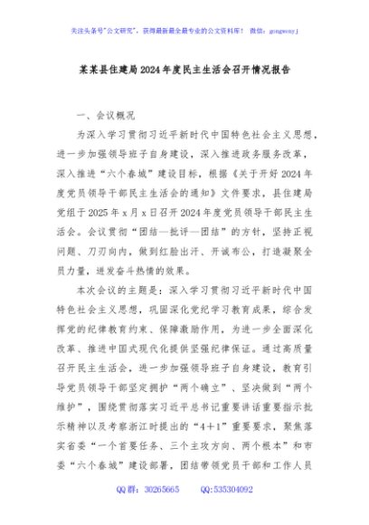 / 某某县住建局2024年度民主生活会召开情况报告