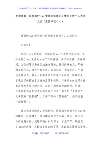 / 在党委第一巡视组对xxx党委巡视意见反馈会上的个人表态发言(党委书记个人)