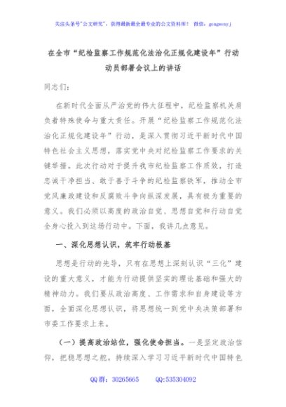 / 在全市“纪检监察工作规范化法治化正规化建设年”行动动员部署会议上的讲话