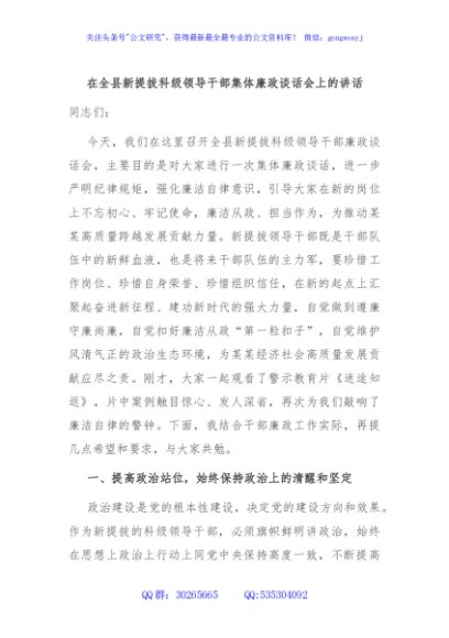 / 在全县新提拔科级领导干部集体廉政谈话会上的讲话