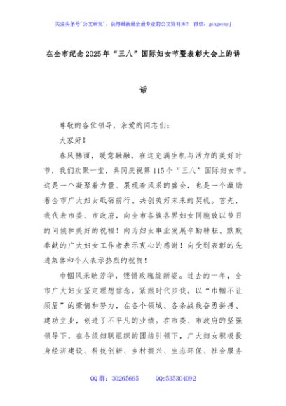 / 在全市纪念2025年“三八”国际妇女节暨表彰大会上的讲话
