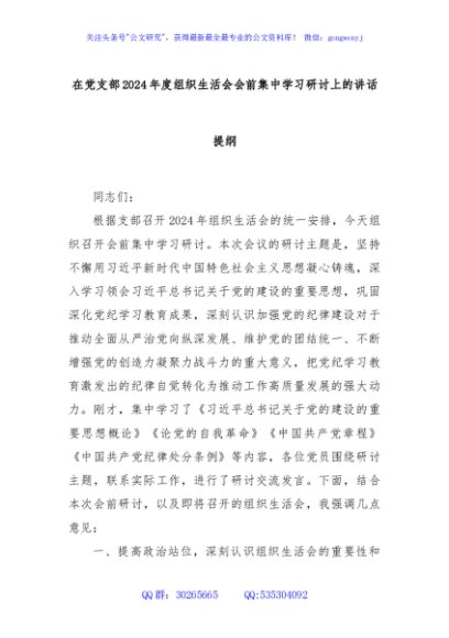 / 在党支部2024年度组织生活会会前集中学习研讨上的讲话提纲