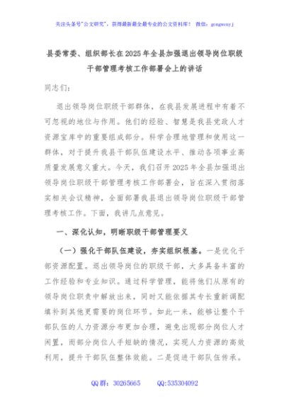 / 县委常委、组织部长在2025年全县加强退出领导岗位职级干部管理考核工作部署会上的讲话