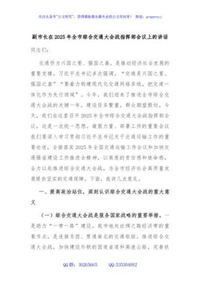 / 副市长在2025年全市综合交通大会战指挥部会议上的讲话