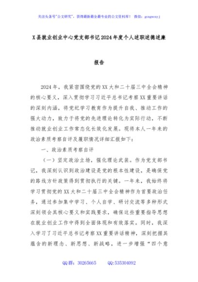 / X县就业创业中心党支部书记2024年度个人述职述德述廉报告