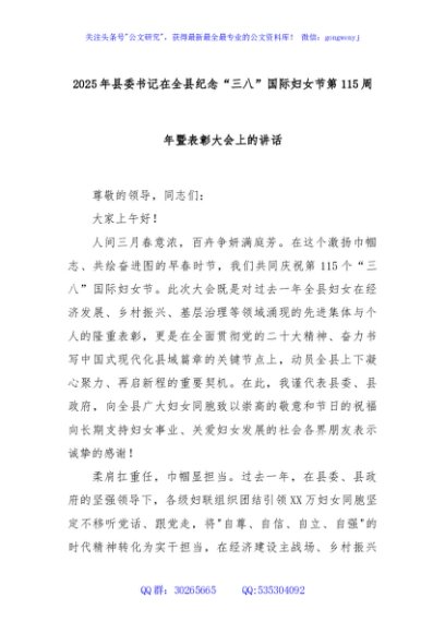 / 2025年县委书记在全县纪念“三八”国际妇女节第115周年暨表彰大会上的讲话