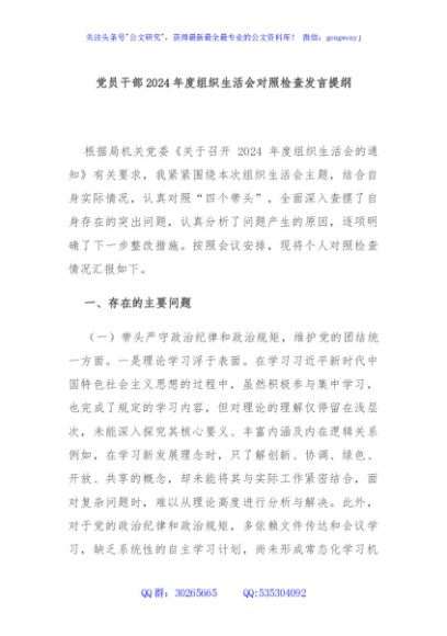 / 党员干部2024年度组织生活会对照检查发言提纲