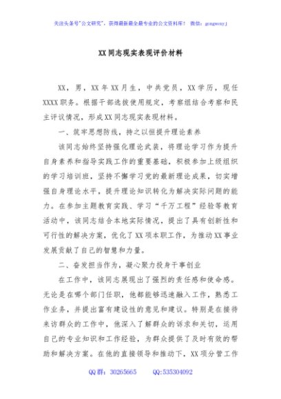 / XX同志现实表现评价材料