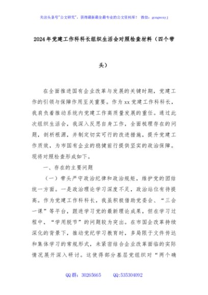 / 2024年党建工作科科长组织生活会对照检查材料(四个带头)