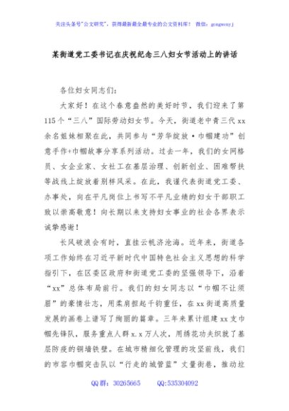 / 某街道党工委书记在庆祝纪念三八妇女节活动上的讲话