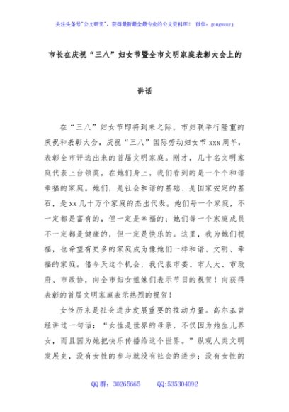 / 市长在庆祝“三八”妇女节暨全市文明家庭表彰大会上的讲话