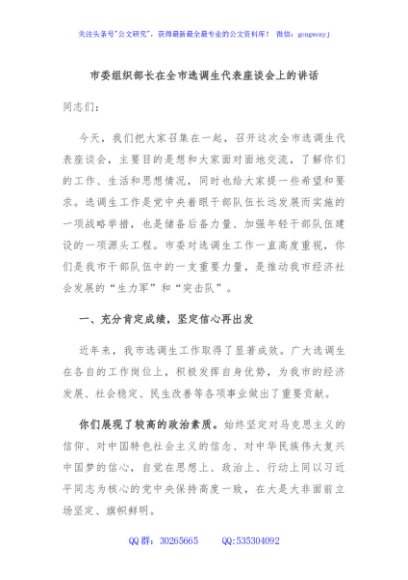 / 市委组织部长在全市选调生代表座谈会上的讲话