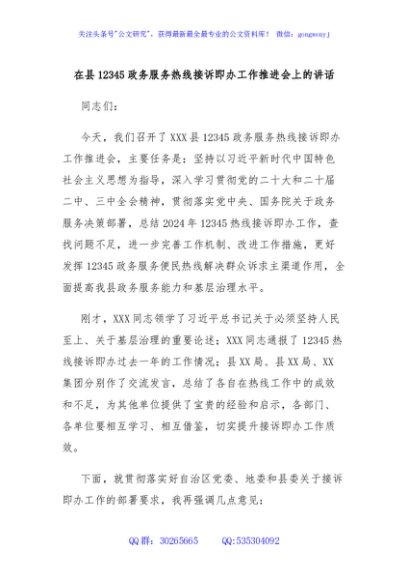 / 在县12345政务服务热线接诉即办工作推进会上的讲话